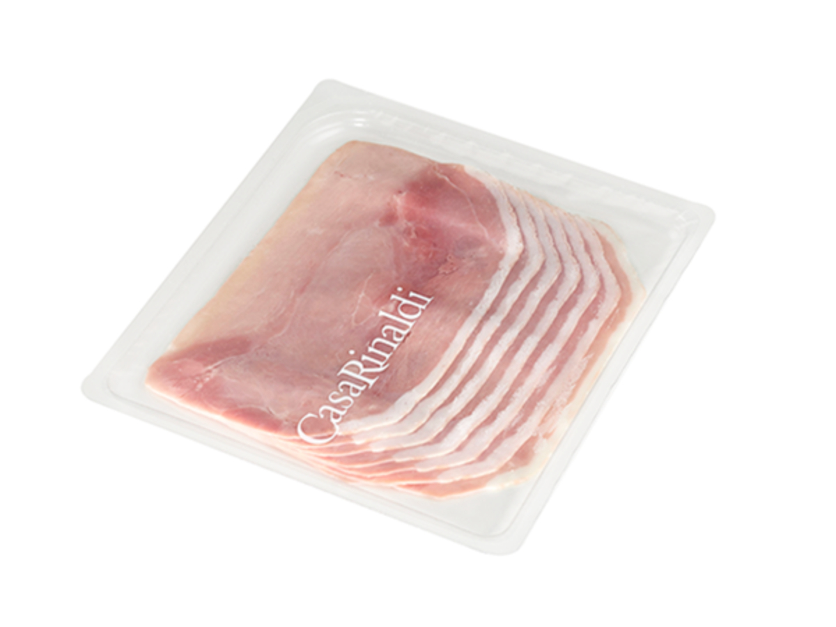 Ein delikater Rohschinken aus ausgewählten Schweinekeulen aus der Europäischen Union, der in Italien nach traditioneller Art gereift wird. Das Fleisch hat eine schöne, intensiv rote Farbe, der Duft ist charakteristisch und der Geschmack ist köstlich und ausgewogen, nie zu salzig.