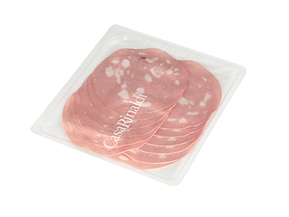 Ein Spitzenprodukt der emilianischen Tradition, das aus einer Fleischmischung mit frischen Gewürzen hergestellt wird. Für unsere Mortadella haben wir die klassische Version gewählt, bei der der schwarze Pfeffer dominiert. Die Mortadella ist zart und sehr aromatisch, ohne Rauchgeschmack; die Scheiben sind samtig, weich und sehr schmackhaft. Um diese Ergebnisse zu erzielen, ist es wichtig, die Regeln des Kochprozesses zu beachten, der sehr langsam in einem Ofen mit trockener Luft und unter voller Berücksichtigung der Zutaten durchgeführt wird.