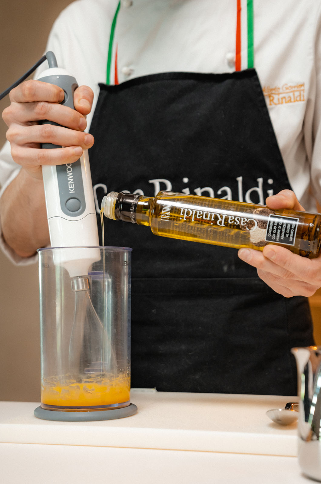 For the mayonnaise, whip the egg yolks in a mixer and add the oil slowly; first the truffle oil and then the peanut oil.