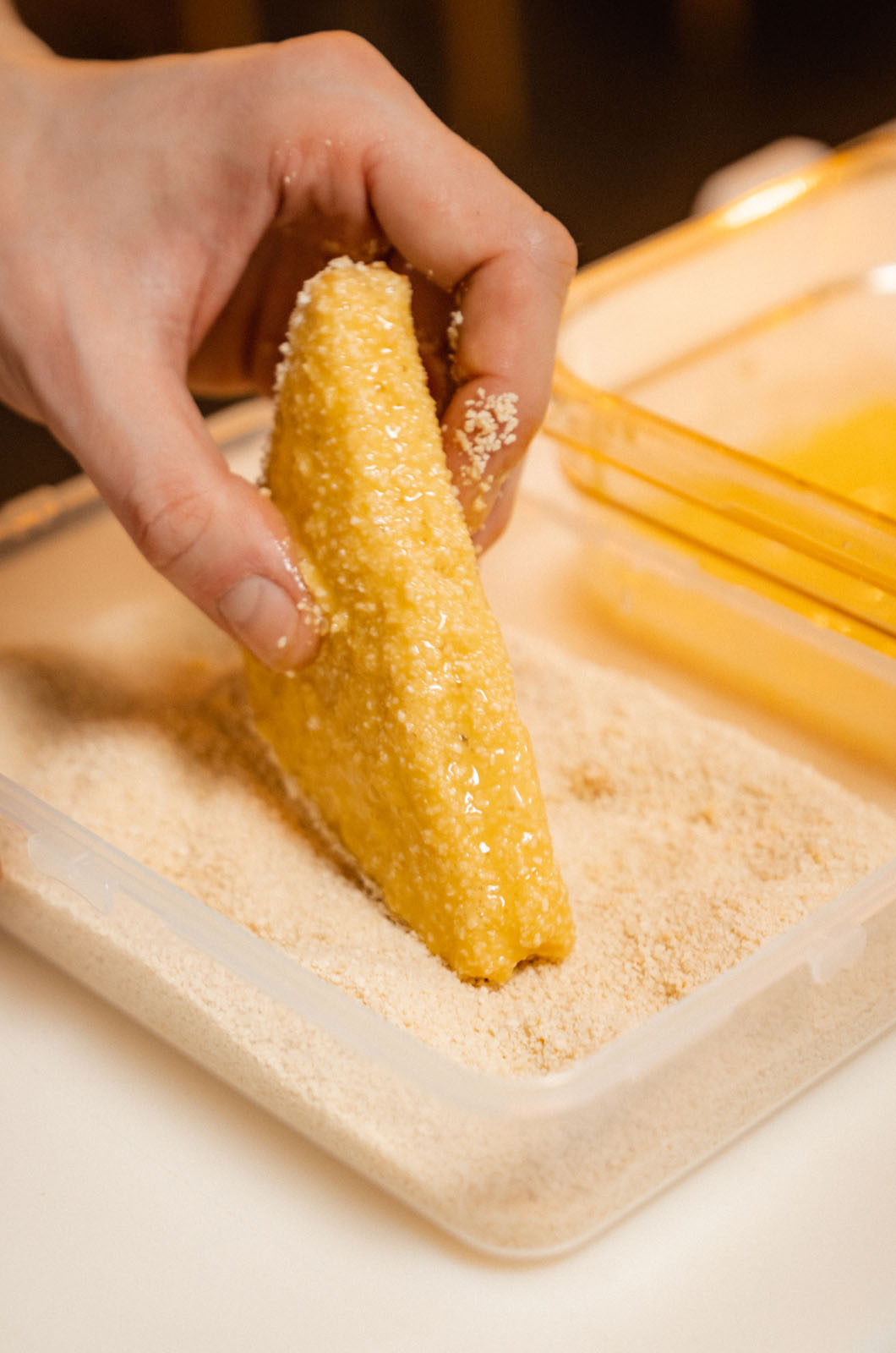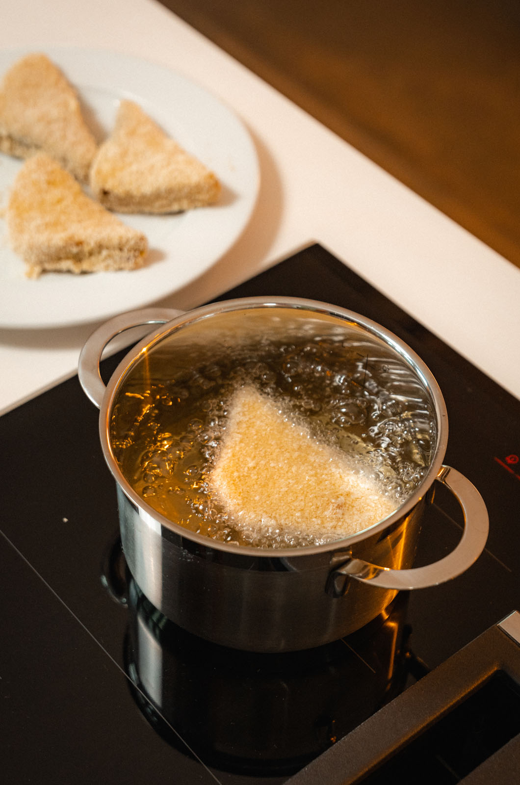 Dip the sandwich in 4 eggs and then in the breadcrumbs. Repeat twice.