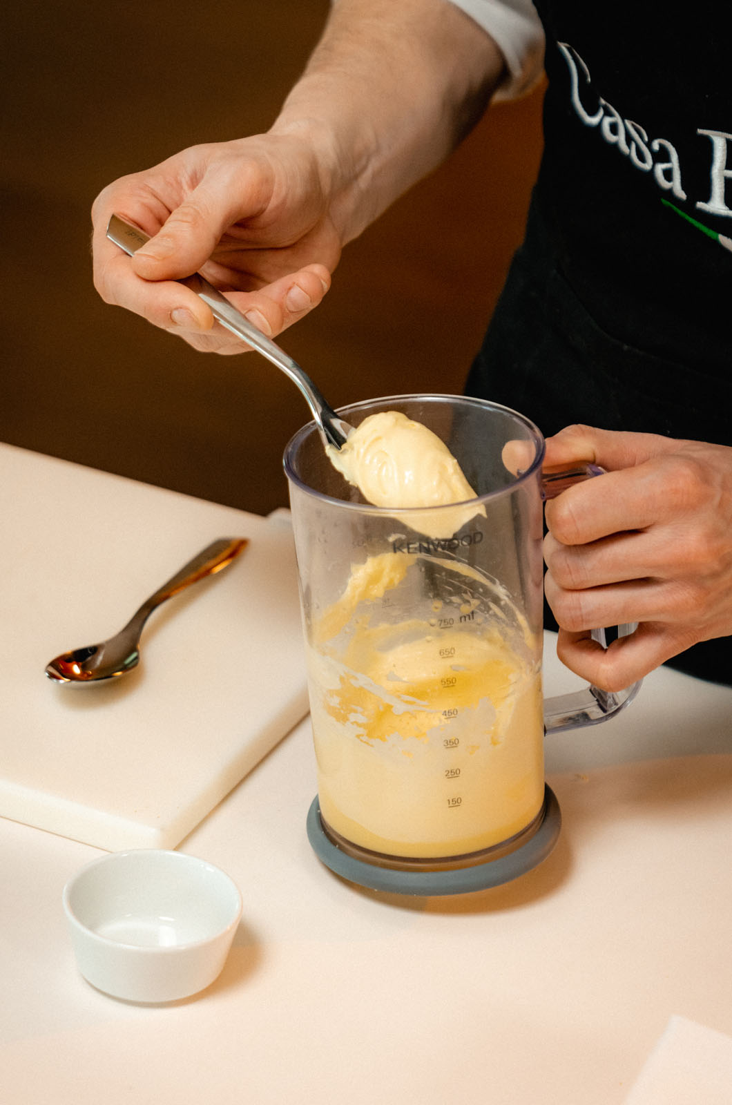 When the texture is firm, add the lemon juice. Regulate the salt.