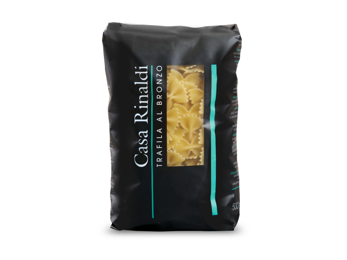 Farfalle n. 505 by Casa Rinaldi recall handmade pasta thanks to their rough surface and their full-bodied consistency. The scent is delicate, as is the taste. Given the particular and distinctive shape, they are perfect for those who love pasta al dente. Cook the farfalle in boiling salted water following the box indications and season with one of the sauces from our selection. Farfalle are also perfect for preparing cold pasta with cherry tomatoes, mozzarella and basil.