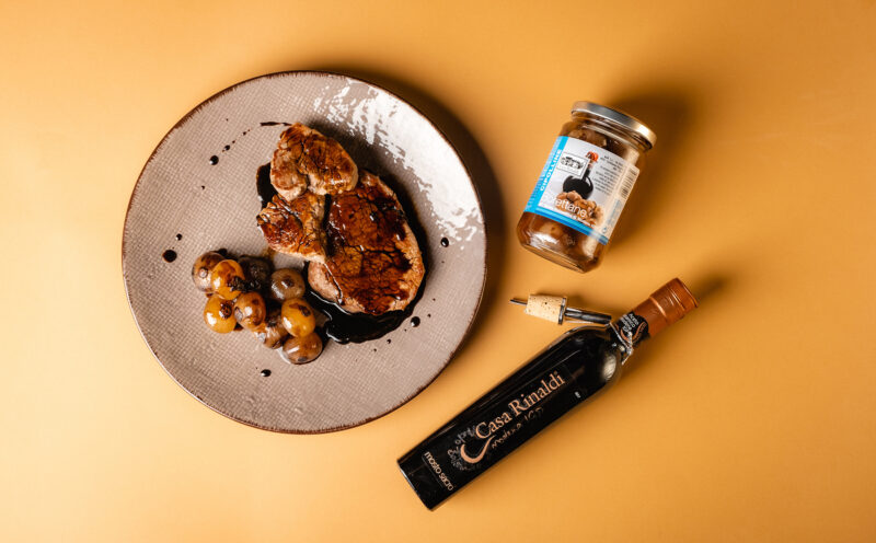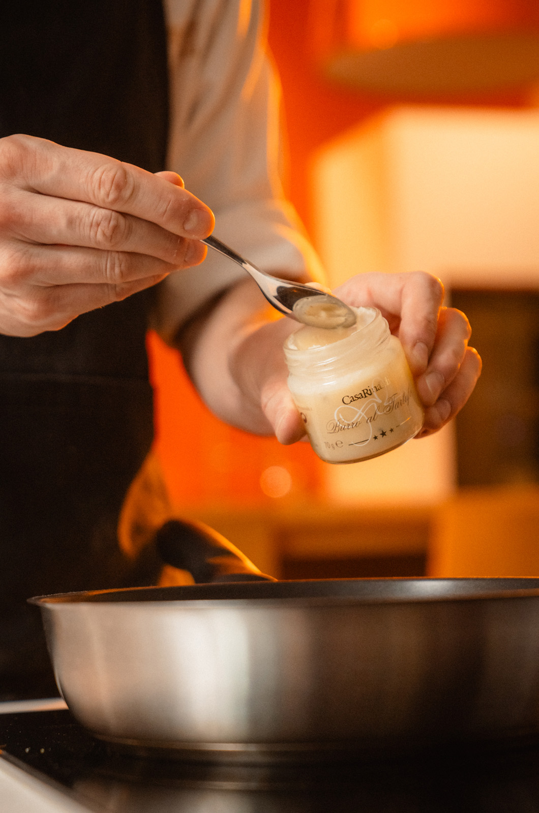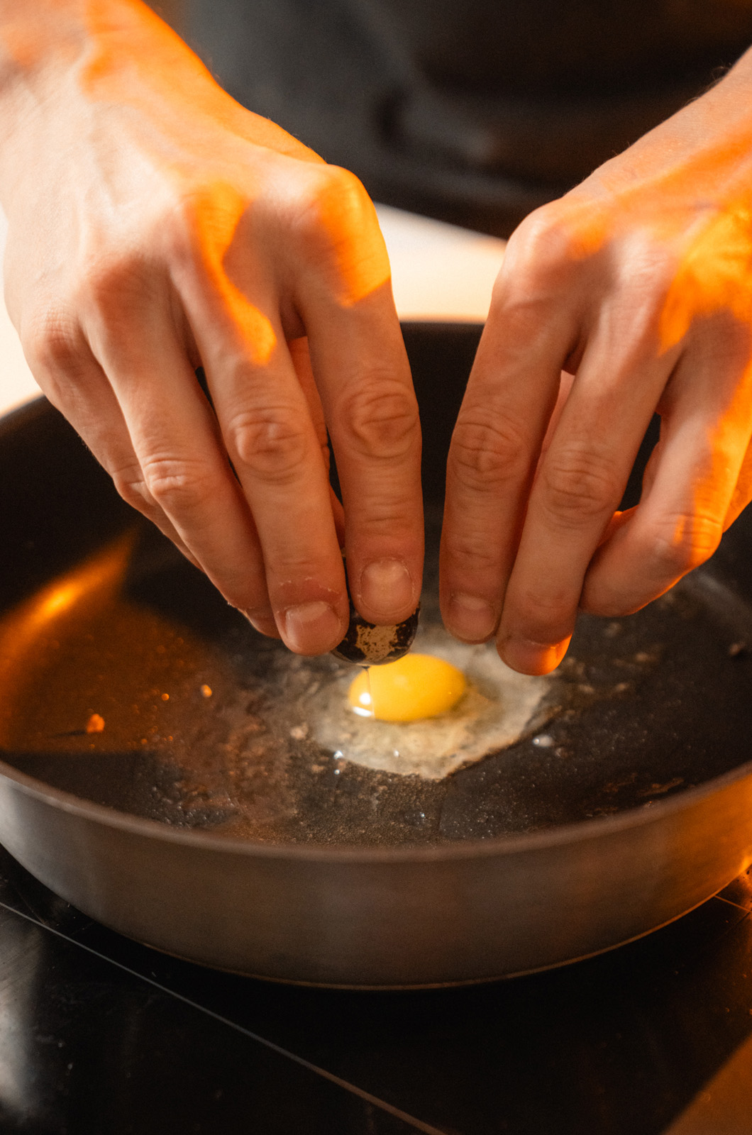 Melt a knob of truffle butter in a pan and cook the quail eggs. Put them aside.
