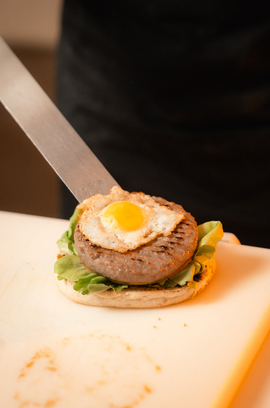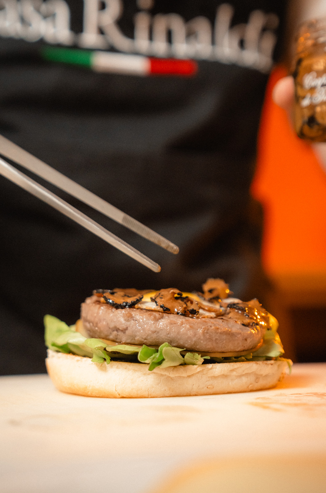 It’s now time to assemble the ingredients of the burger: spread some black truffle cream on the bread, add the lettuce and the burger with cheese. Lay the quail egg and complete with few truffle shaves.