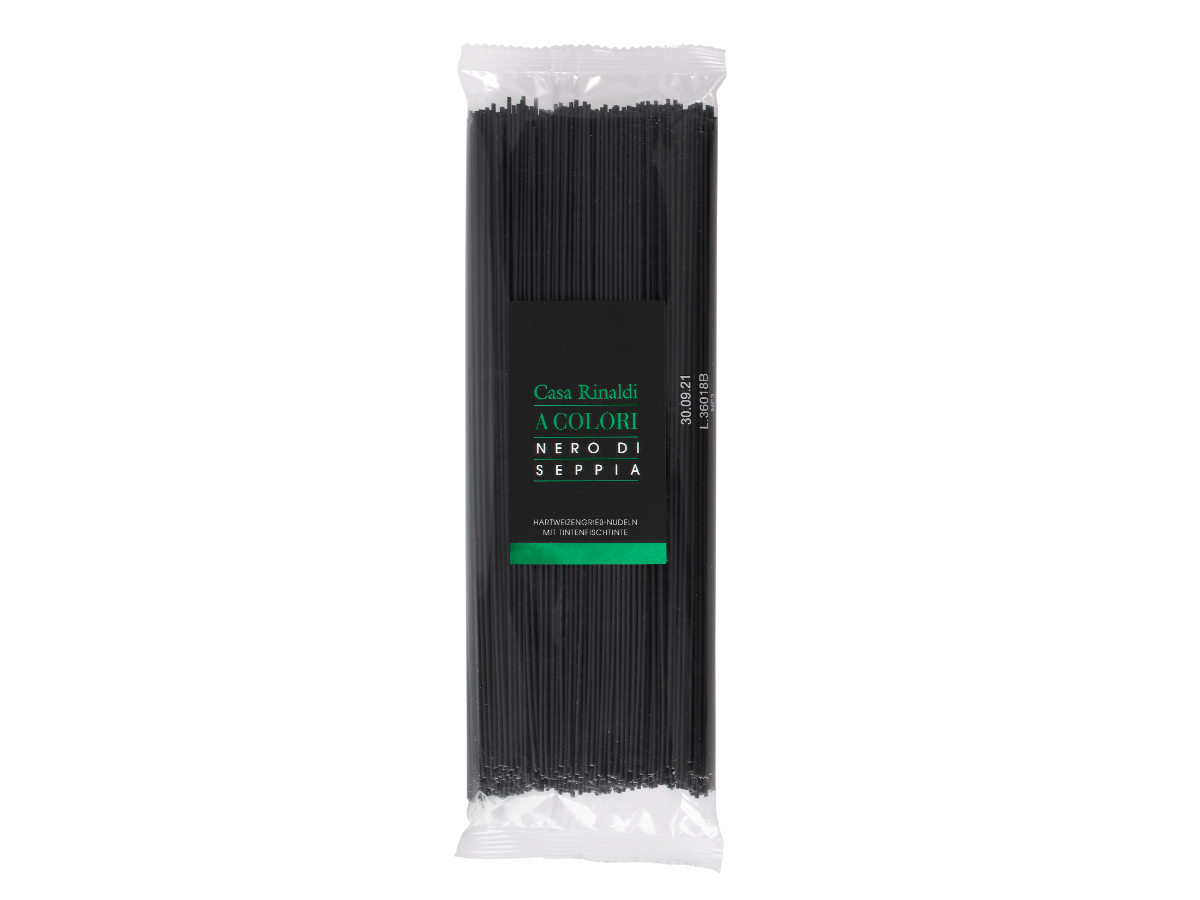 I nostri spaghetti al nero di seppia nascono da semola di grano duro accuratamente selezionata. Il nero di seppia utilizzato per colorarli e aromatizzarli conferisce a questa pasta il tipico colore nero, il riconoscibile sentore di pesce e molluschi e un sapore di mare intenso e sapido.