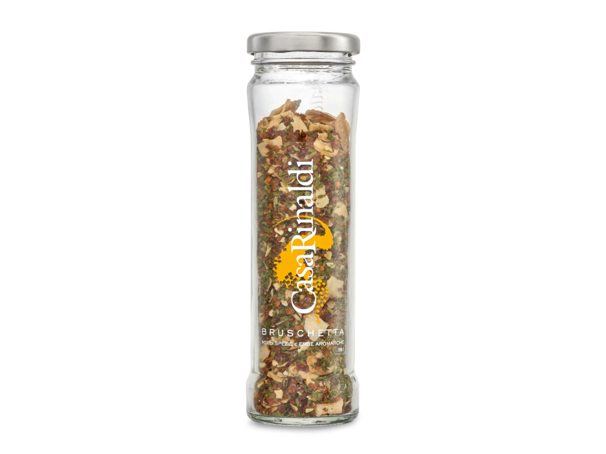 Il mix “Bruschetta” è composto da diverse spezie miscelate in modo da conferire ai cibi un gusto armonioso, senza però coprirne i vari sapori. Il mix realizzato da Casa Rinaldi contiene aglio, peperoncino e prezzemolo, i cui aromi e sentori sono facilmente riconoscibili. Può essere utilizzato per insaporire la preparazione composta da pane abbrustolito, olio extra vergine di oliva, sale e pomodoro a cubetti dalla quale prende il nome. È perfetta anche per condire pasta o pizza eventualmente tritato con un macina-spezie. Può essere infine abbinato a preparazioni di carne in umido o nella cottura di legumi.