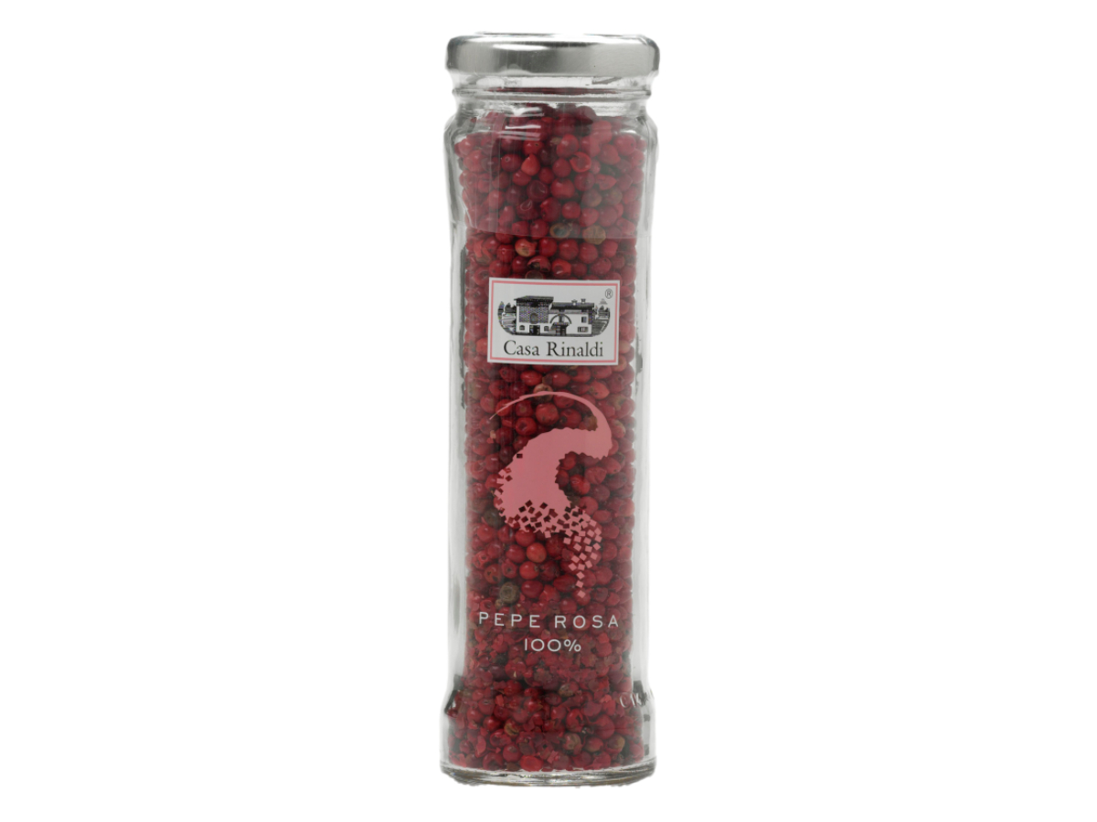 Il pepe rosa viene raccolto dall’albero del pepe brasiliano, i cui frutti hanno un colore rosa brillante. Si tratta di una spezia molto decorativa, utilizzata per preparare piatti eleganti e caratterizzata un sapore delicato, dolce e speziato, con interessanti note di limone. Il pepe rosa di Casa Rinaldi, disponibile in un vasetto da 50 grammi, è ideale per la preparazione di pietanze a base di carni bianche, carpacci di pesce, crostacei, insalate e macedonie di frutta, dessert e yogurt, nonché verdure come asparagi, piselli e carciofi.