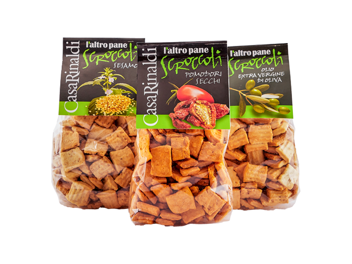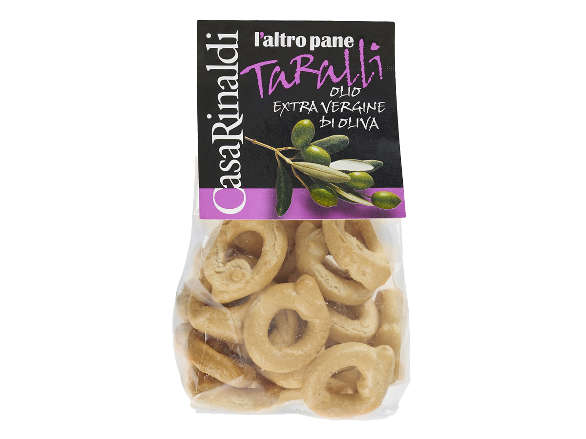 Casa Rinaldi porta avanti questa tradizione realizzando taralli particolarmente friabili, dal sapore genuino e inconfondibile. Caratteristiche tipicamente pugliesi ancora oggi presenti nel tarallo sono la preparazione con olio extravergine di oliva e l’aggiunta di spezie che vanno dai semi di finocchio al peperoncino.