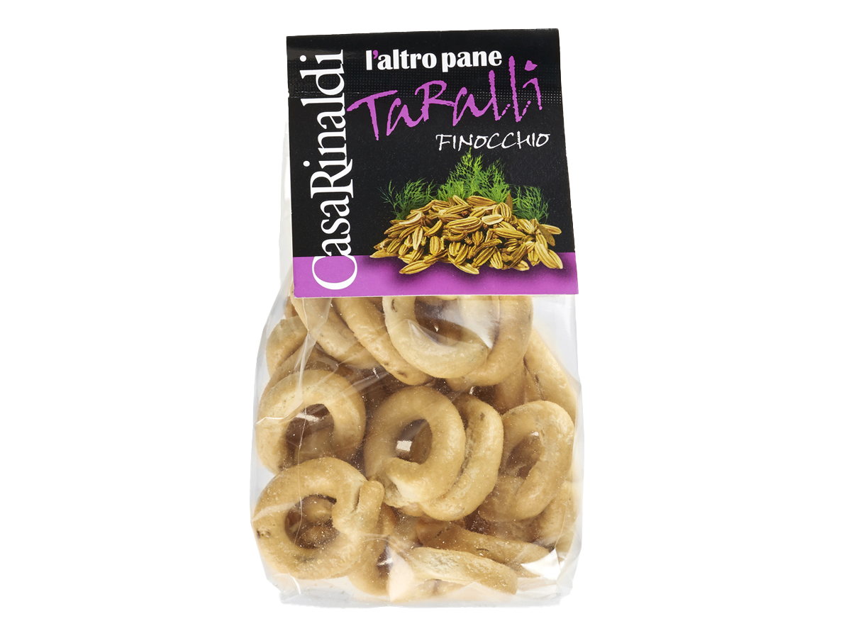 I taralli con i semi di finocchio sono una rivisitazione tipica della tradizione pugliese; il sapore del finocchio è intenso e caratteristico, e gli stessi semi sono ben visibili. Sono un perfetto sostitutivo del pane, ideali per accompagnare salumi, formaggi e insalate, come aperitivo e come snack durante e fuori dai pasti.