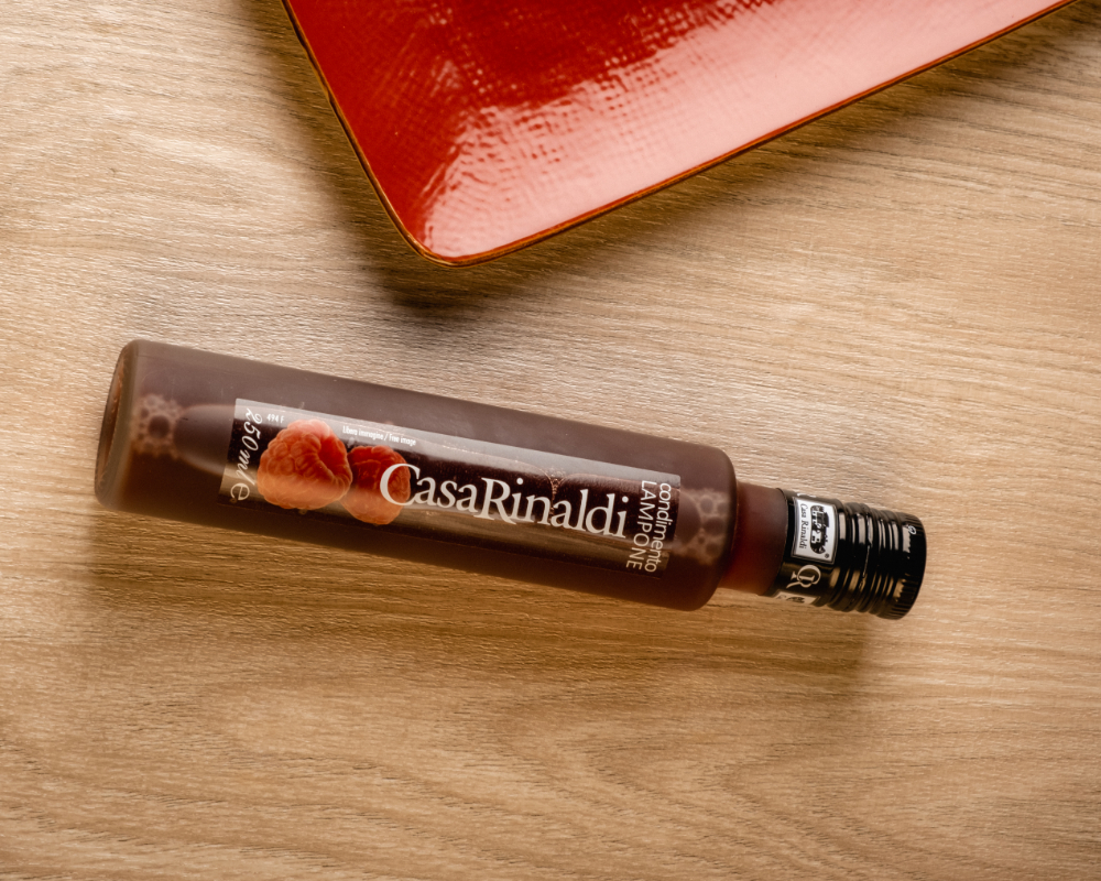 L’aceto al lampone di Casa Rinaldi è un elisir di gusto e aroma che unisce l’aceto di vino rosso al succo di uno dei frutti di bosco più apprezzati in cucina.