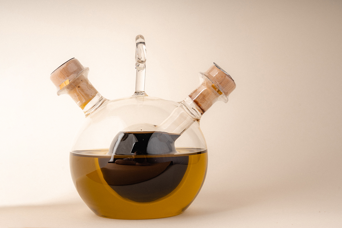 Il set “Pyrex” porta a tavola i condimenti classici di Casa Rinaldi in un modo unico al mondo, frutto di creatività ed esperienza. Il set si compone di due bottiglie sferiche, una all’interno dell’altra, contenenti rispettivamente 50 ml di aceto balsamico di Modena e 250 ml di olio extravergine di oliva; il tutto, poi, è accompagnato da un elegante astuccio in cannette.