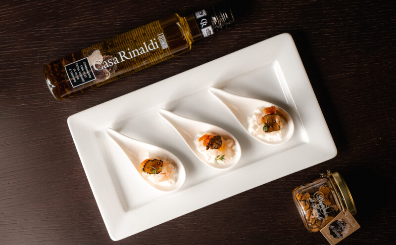 Completare il piatto con 2 o 3 cucchiaini di salsa tartufata e qualche filo di erba cipollina.