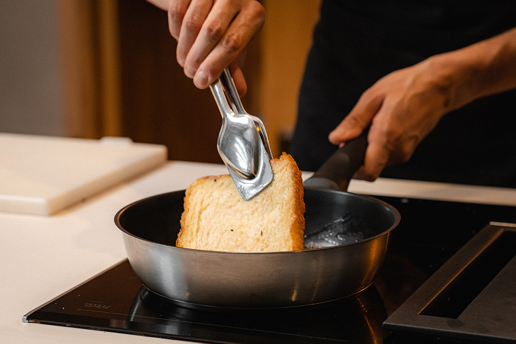 Una volta caldo e sfrigolante, passare le fette di pane in padella finché non saranno dorate e croccanti. Togliere il pane e tenerlo al caldo.