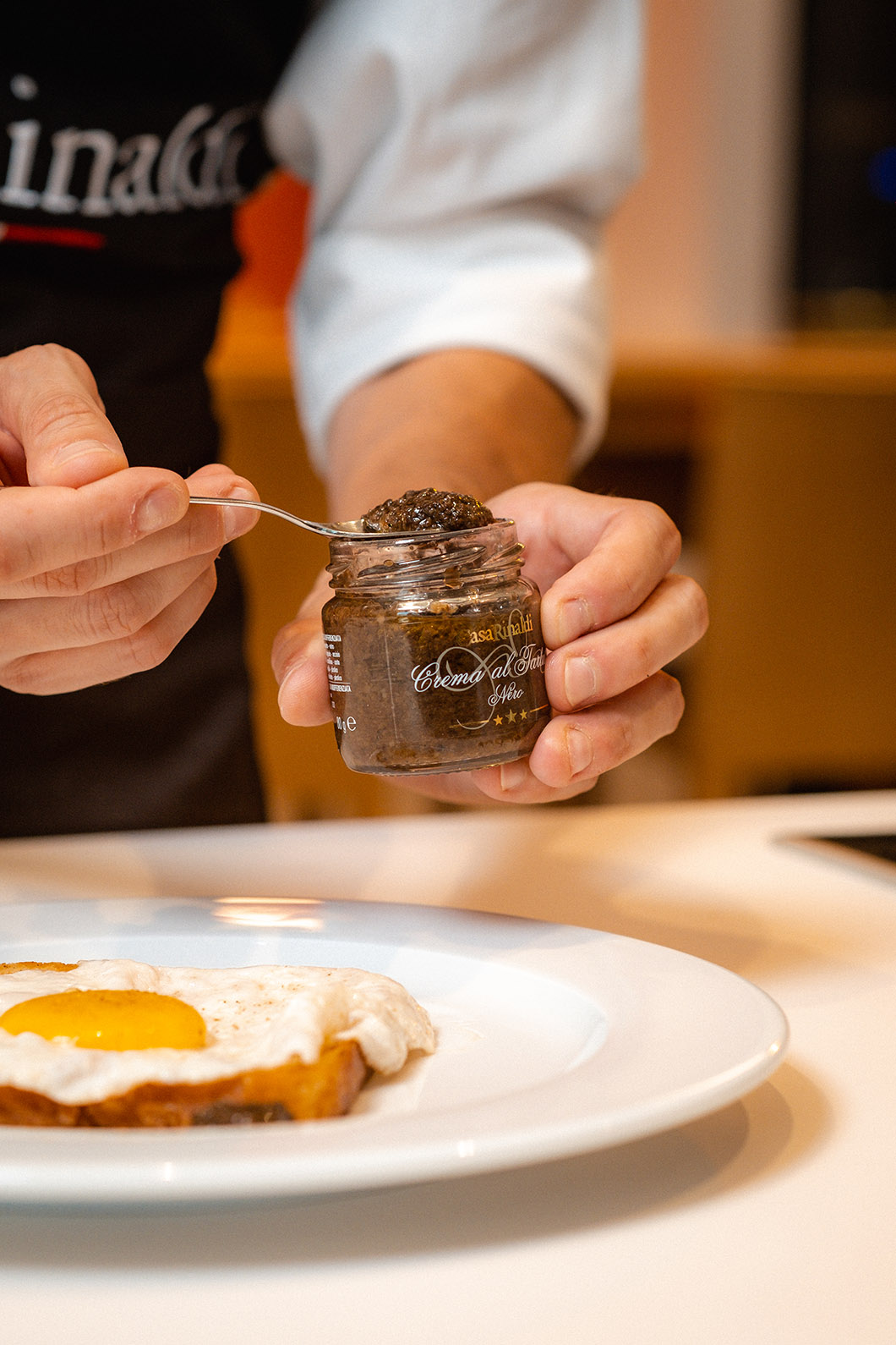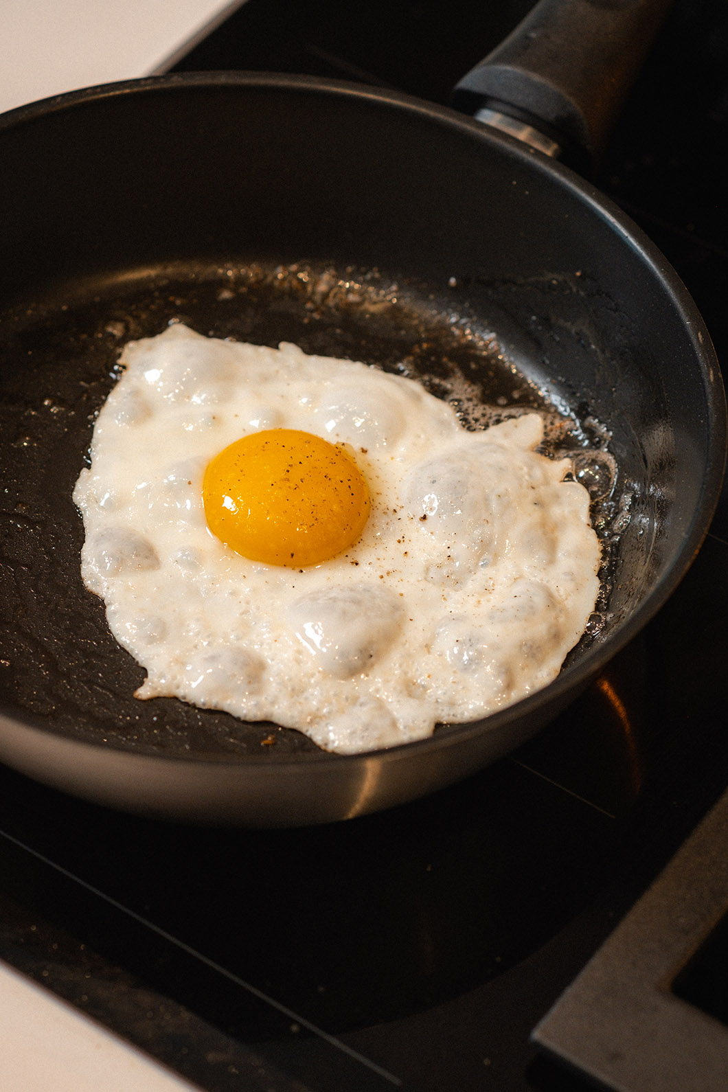 Nella stessa padella aggiungere ancora un noce di burro e procedere alla cottura delle uova, fino a quando l’albume sarà perfettamente cotto ed il tuorlo ancora morbido e cremoso.