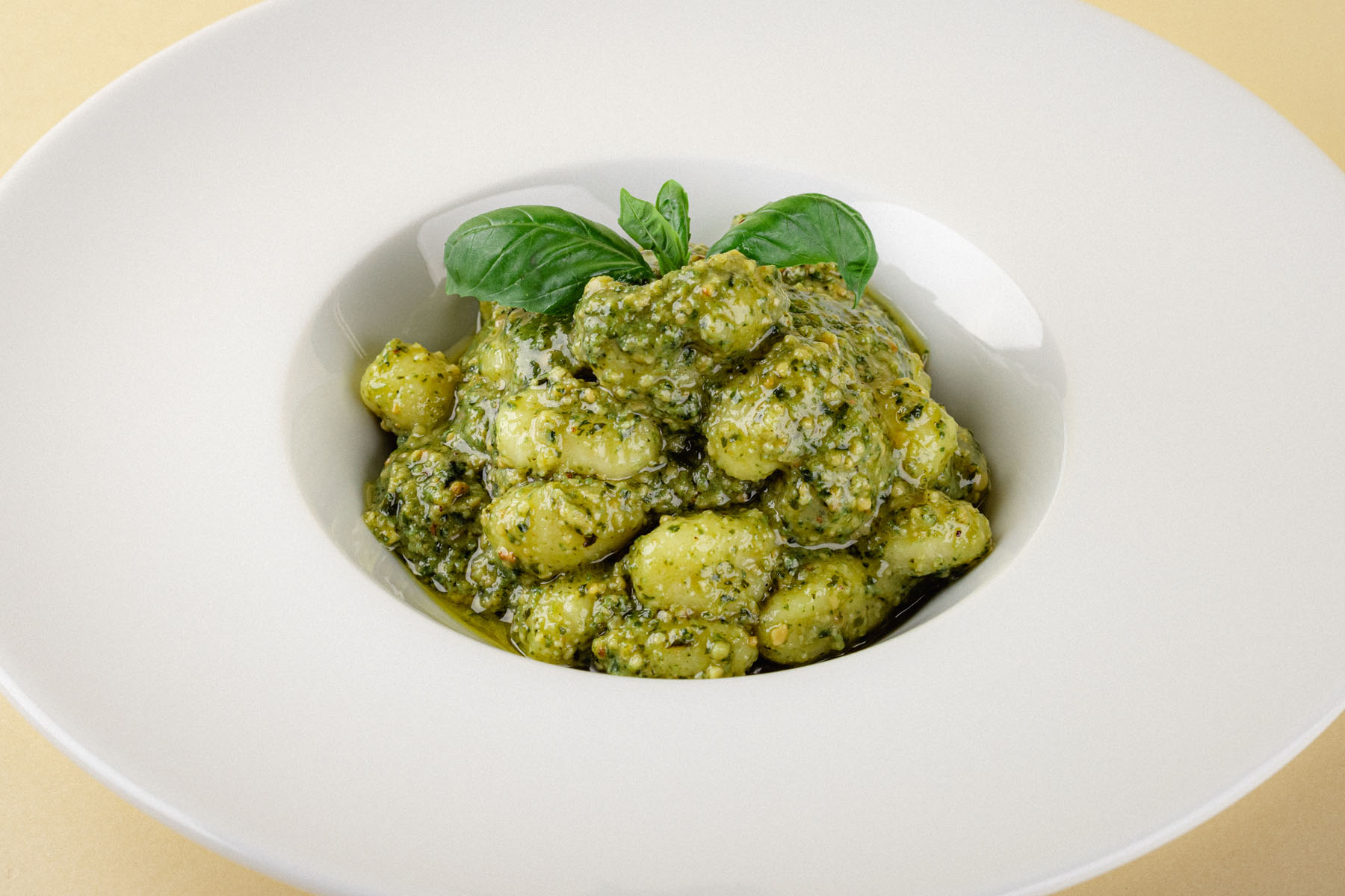 Impiattare gli gnocchi al pesto e completare con un profumato ciuffo di basilico fresco.