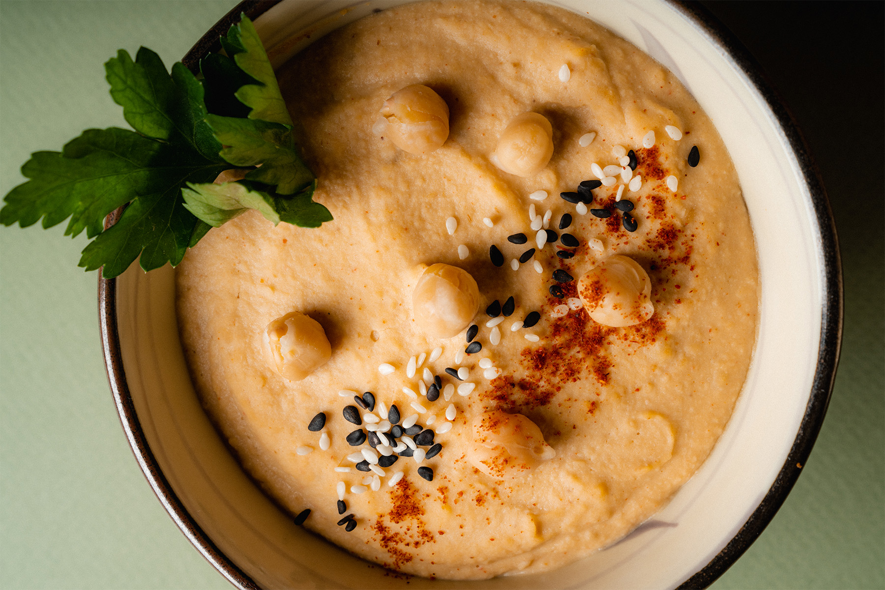 Servire con un filo d’olio, del prezzemolo, un po’ di paprica e semi di sesamo.