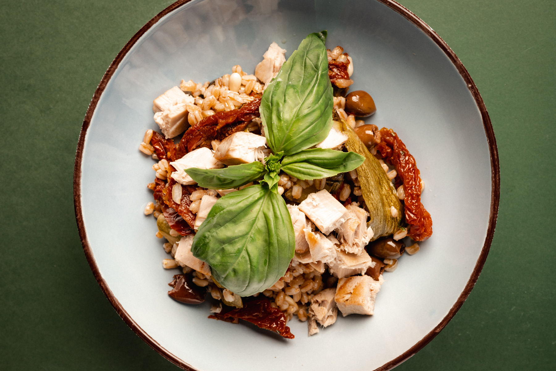Impiattare il farro e completare con qualche foglia di basilico fresco.