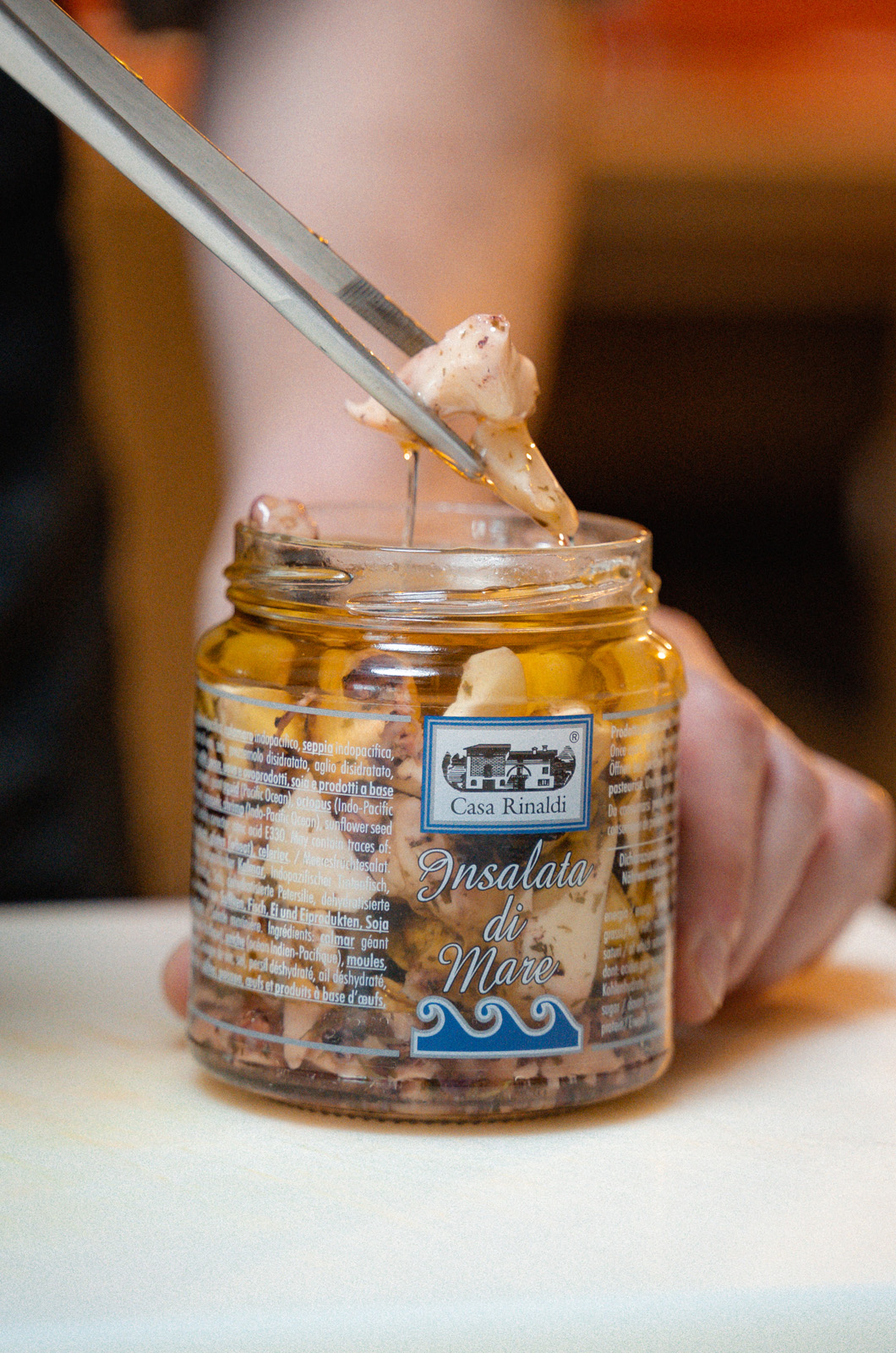 Nel frattempo, si possono preparare tutti gli altri ingredienti: tagliare a metà i pomodorini freschi e tagliare a cubetti l’avocado. Scolare le olive saracene e tagliarle. Scolare l’insalata di mare. Lavare il mais e la rucola.