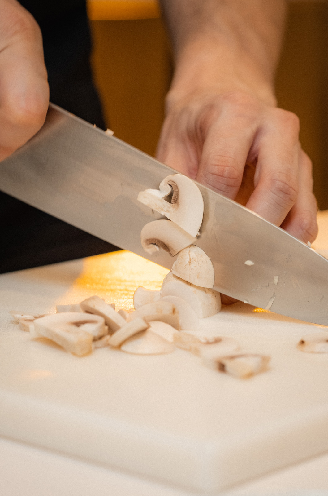Mondare i funghi e tagliarli a pezzi.