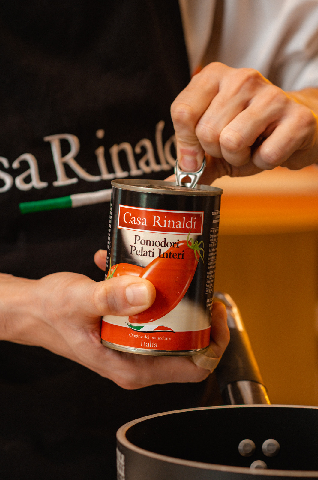 Rosolare l’aglio in padella on olio extra vergine d’oliva e, una volta dorato, aggiungere i pomodori pelati.