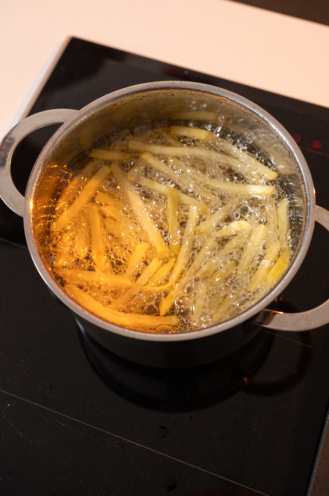 Portare a temperatura l’olio e friggere le patatine 5-6 minuti fino a quando non saranno dorate e croccanti.