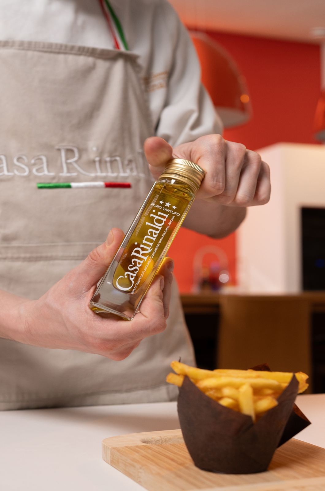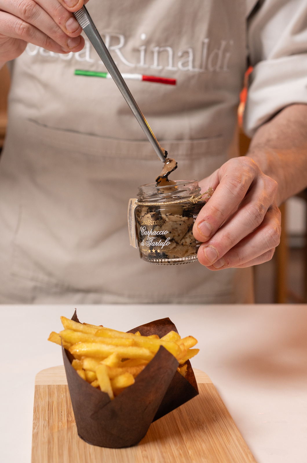 Condire le patatine con l’olio al tartufo e completare con qualche fetta di carpaccio di tartufo.