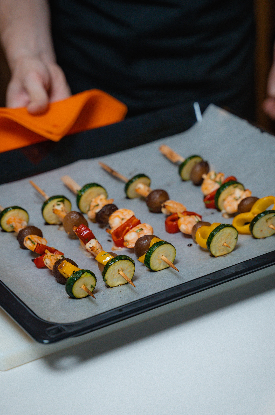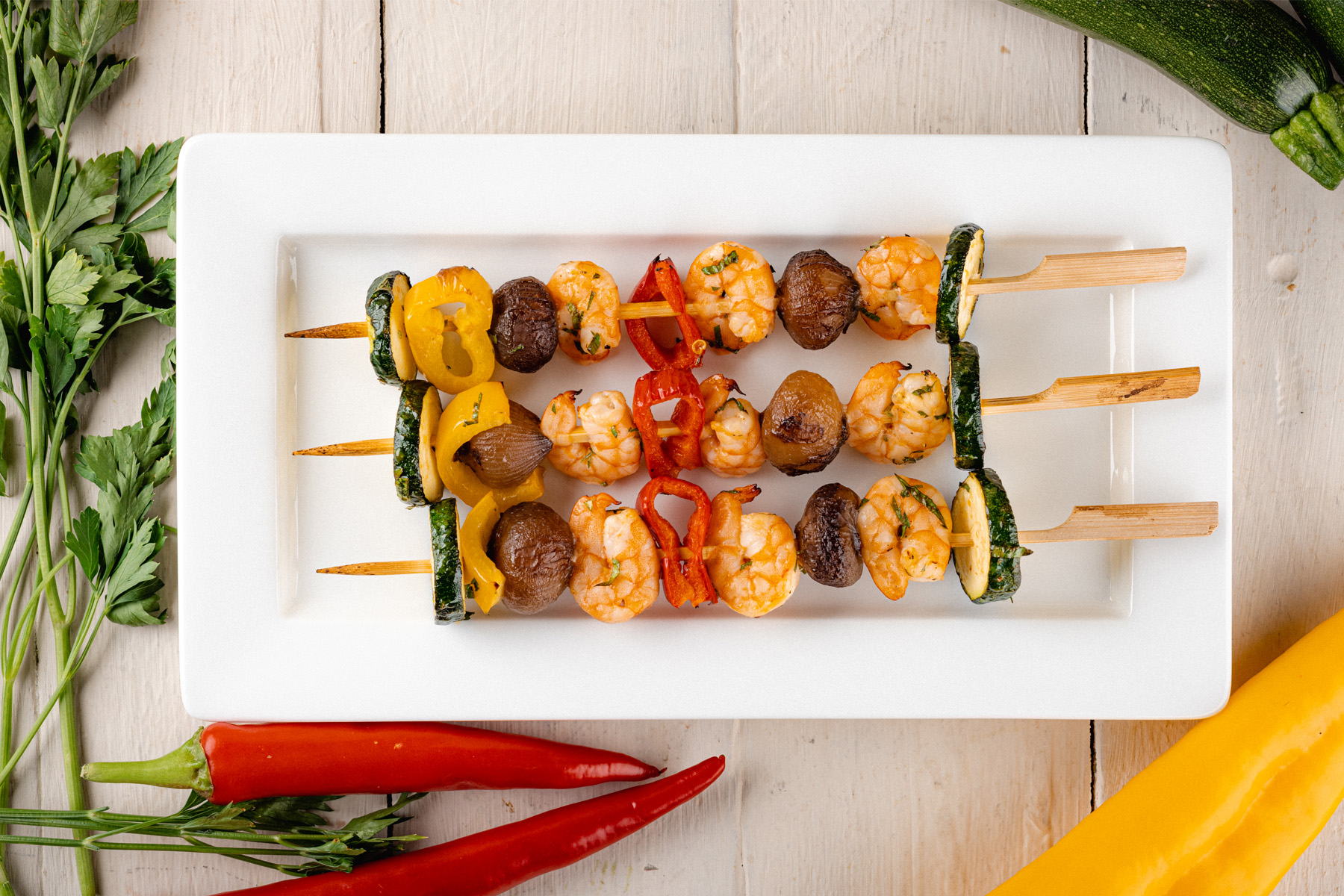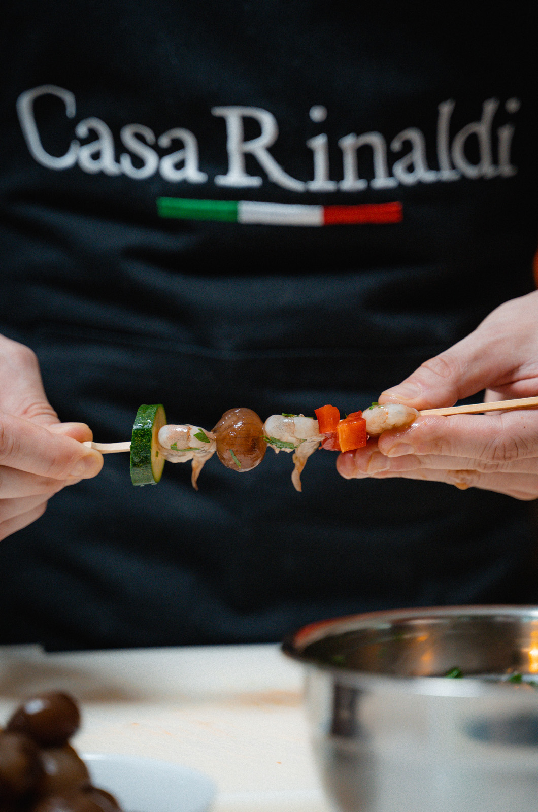Assemblare gli spiedini alternando un gambero, una cipollina borettana Casa Rinaldi, un altro gambero ed un vegetale.