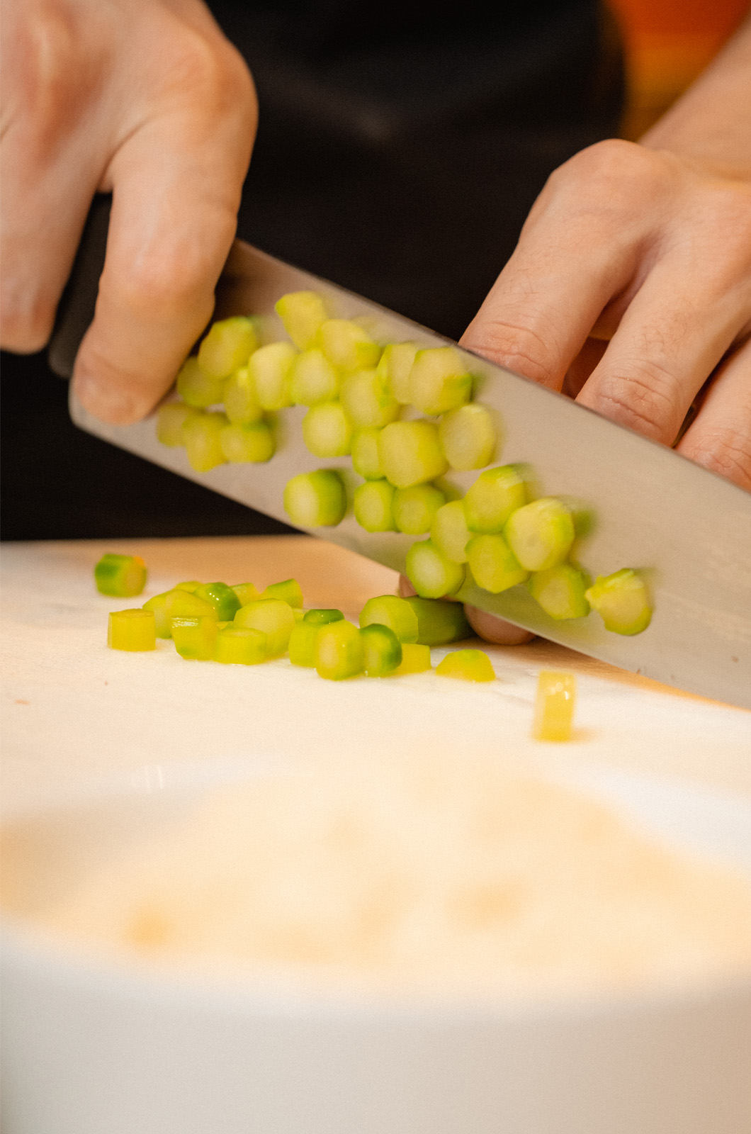 Tagliare i gambi a rondelle e tenere le punte intere.