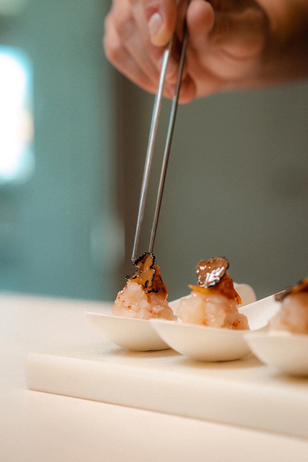 Terminare con un pomodorino semi-secco e una scaglia di tartufo.