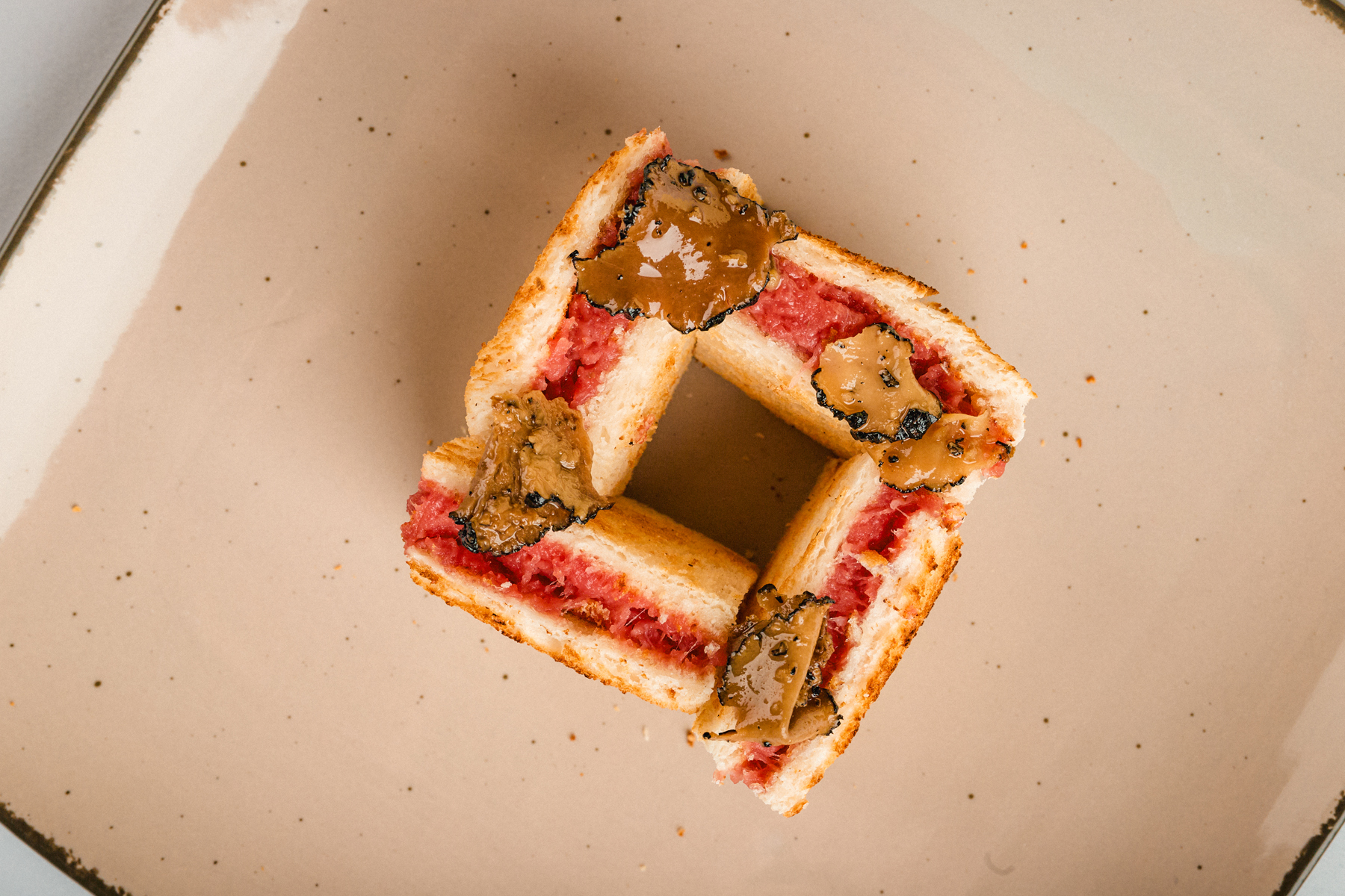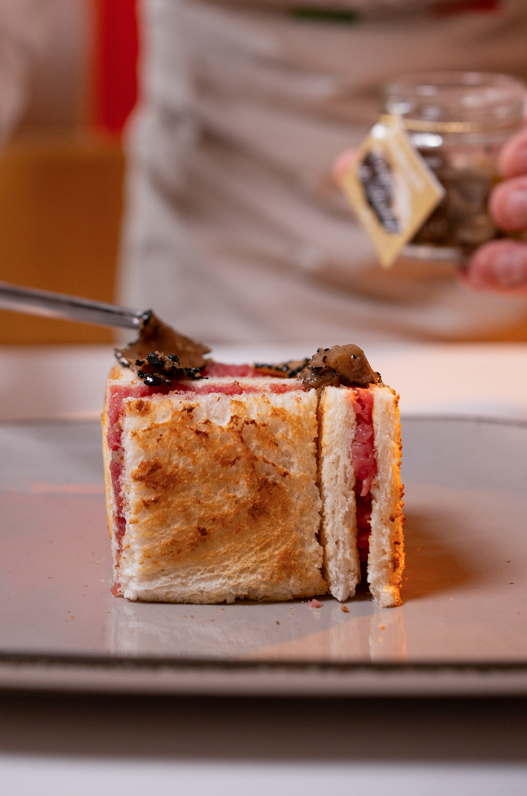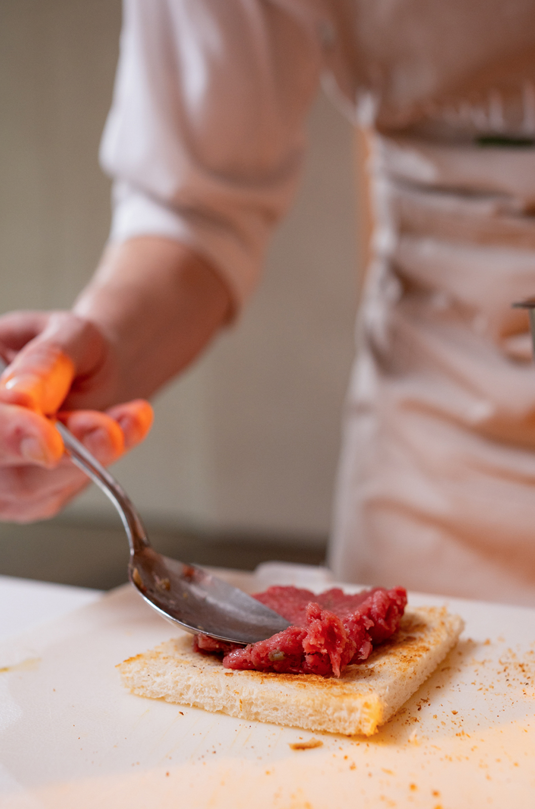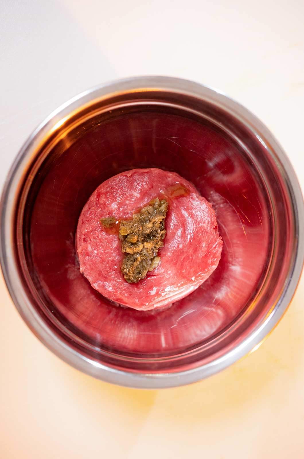 Condire la carne con sale, pepe, un cucchiaino di salsa ai capperi, senape ed un filo di olio al tartufo (consiglio: se la carne non dovesse risultare abbastanza compatta, aggiungere anche un tuorlo d’uovo).