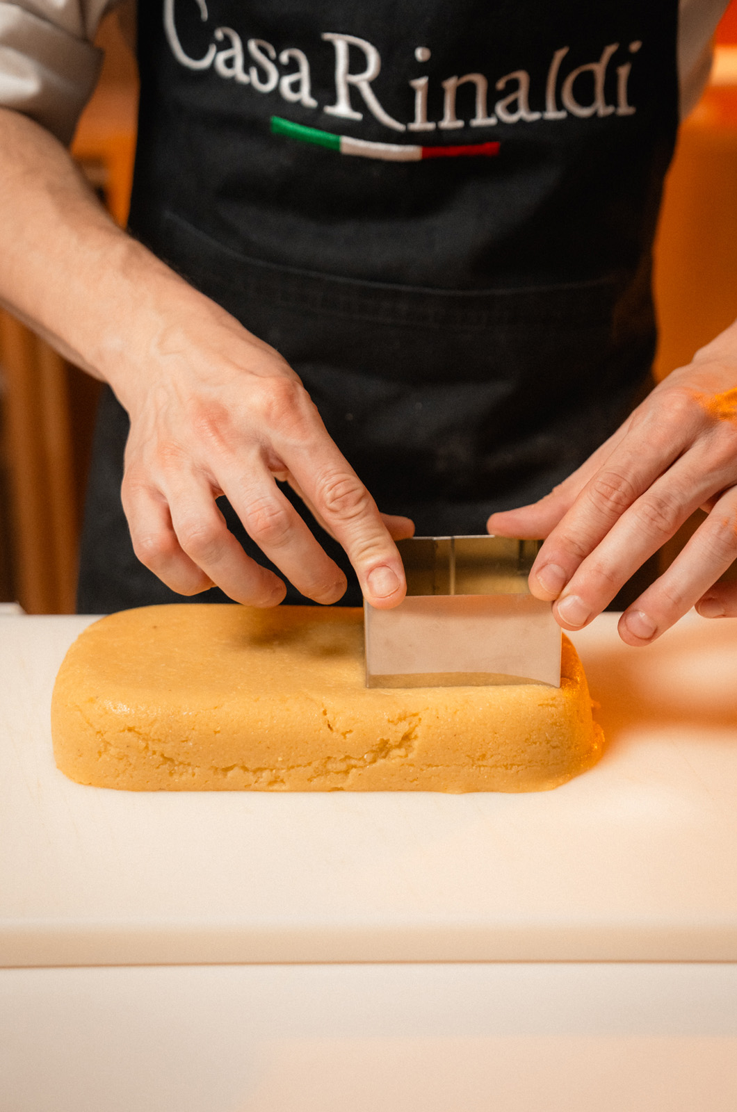 Tagliare la polenta pronta e soda, in fette da 1 cm ciascuna.