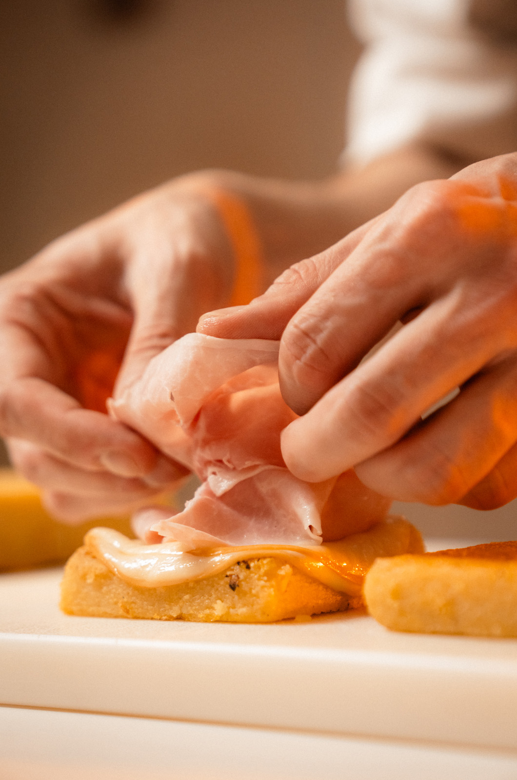 Aggiungere il prosciutto e continuare la cottura sulla piastra a fuoco bassissimo oppure trasferire i toast in forno a 200° per 5 minuti.