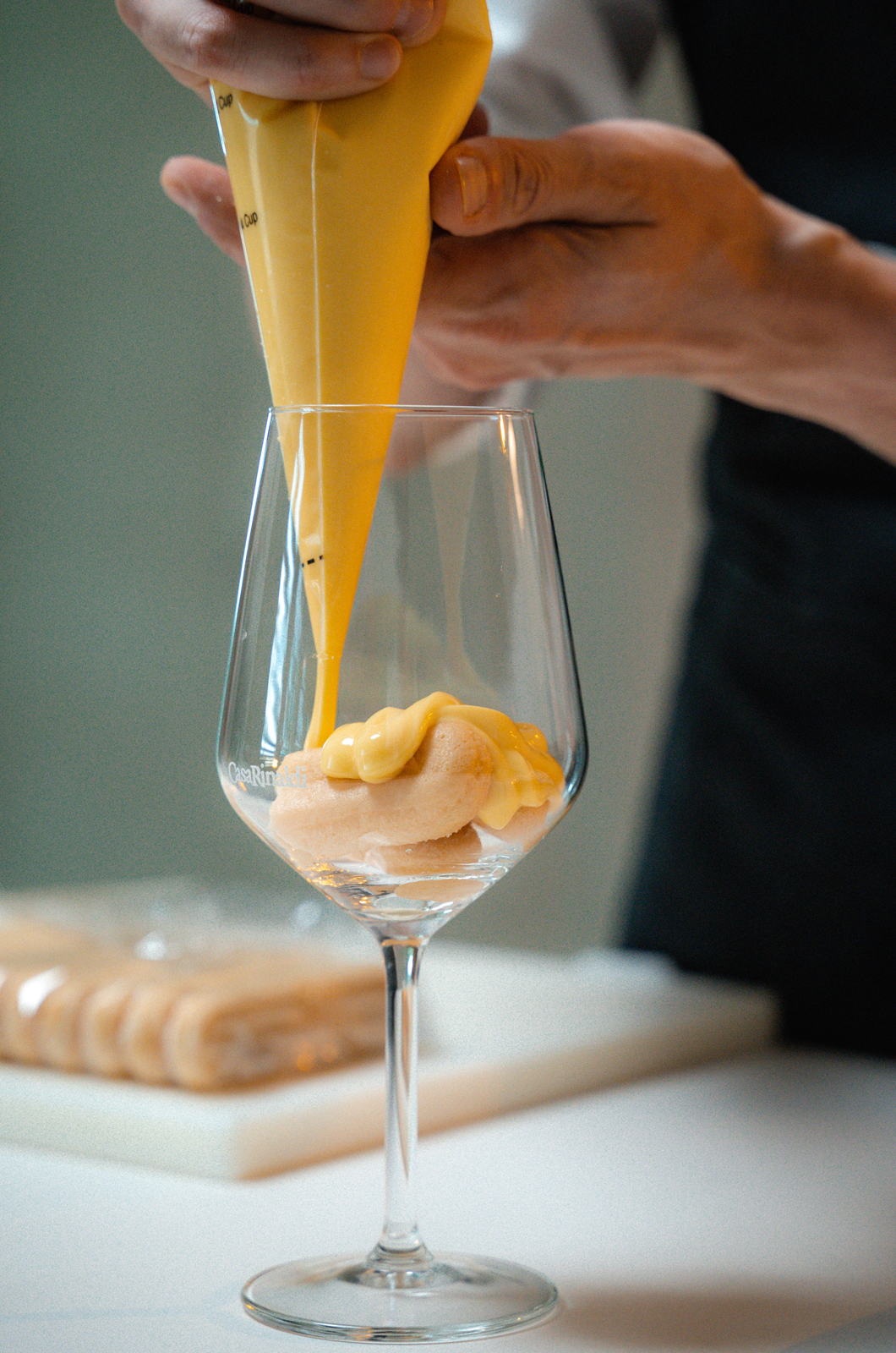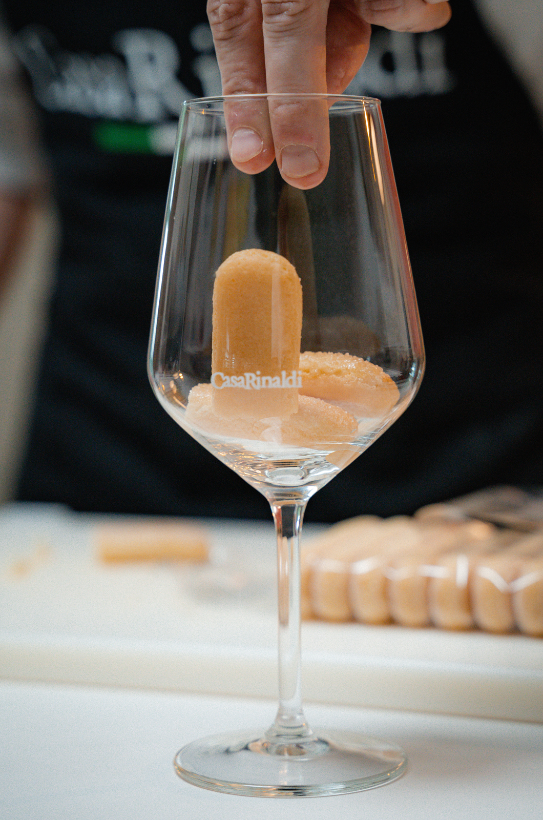 Tagliate i savoiardi per adattarli al bicchiere o alla ciotola e bagnateli nel vino passito.