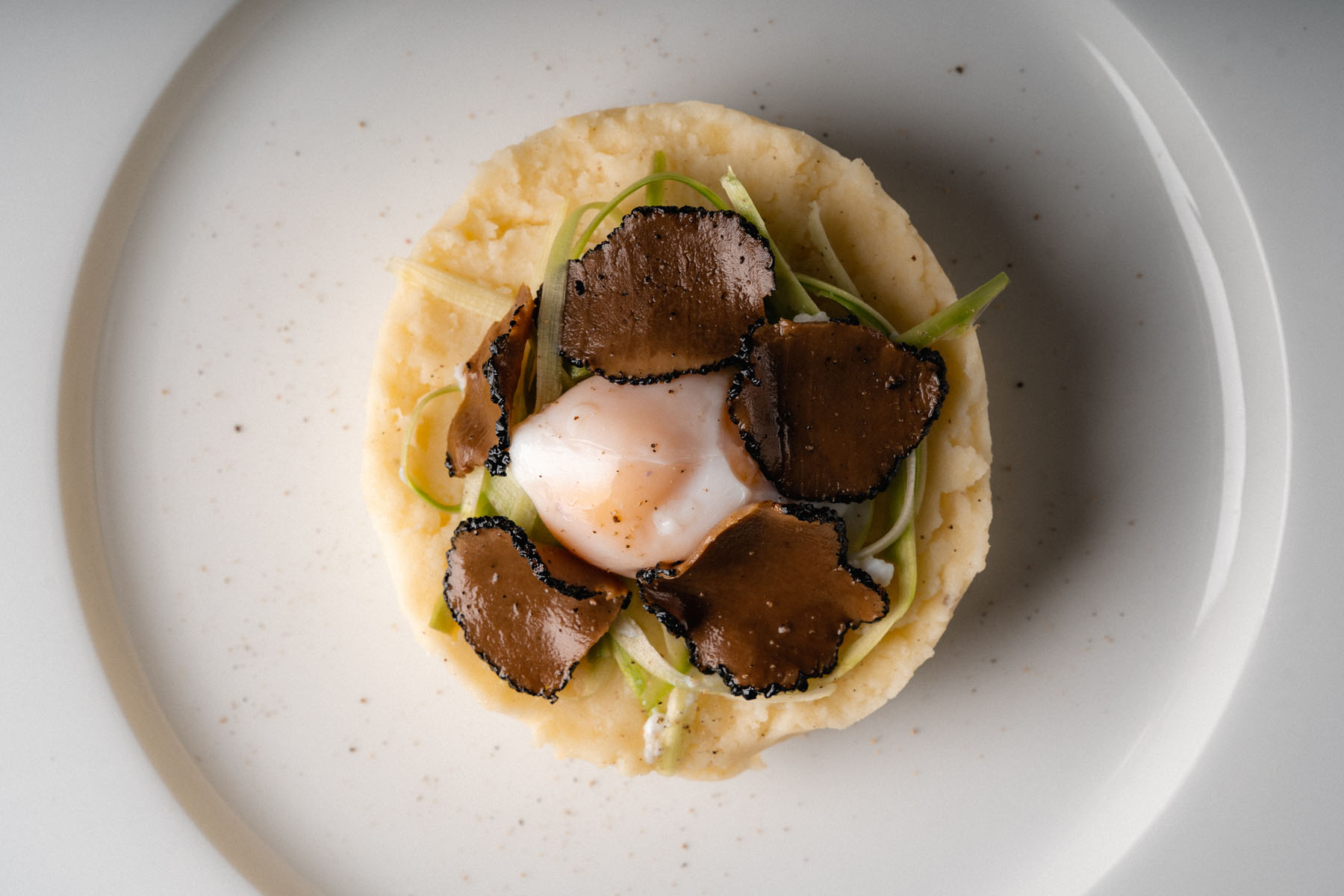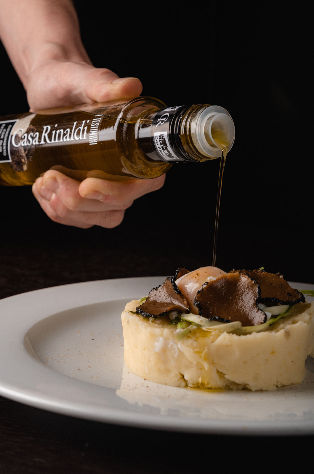 Ora è il momento di comporre il piatto con gli ingredienti preparati e con un’aggiunta finale di olio extra vergine al tartufo e un po’ di pepe.